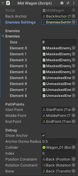 C'est dans cet esprit que la hiérarchie du code, et des éléments du projet fut pensée en amont. Que ce soit avec un wagon "mère", permettant de mettre à jour le visuel de tous les wagons enfants en même temps, l'utilisation de cette même hiérarchie dans le code ou en divisant certains comportement en plusieurs components. Finalement, l'utilisation de l'aléatoire pour les tailles, comportements et couleurs des passagers, permet de ne pas avoir à régler chaque individu un par un. En plus d'offrir un changement bienvenu dans la re jouabilité.